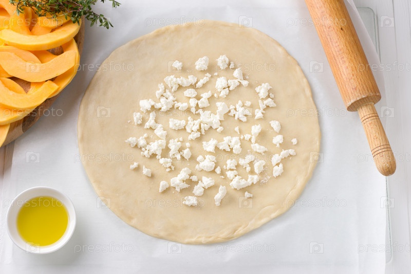 Раскатанное тесто с раскрошенным сыром фета, миска с оливковым маслом, скалка, разделочная доска с нарезанной тыквой и свежим тимьяном на белом фоне. Этап приготовления вкусного домашнего тыквенного пирога