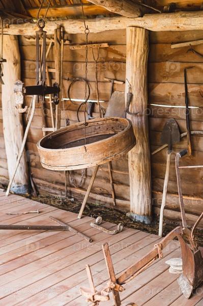Старинные сельскохозяйственные орудия в деревенском деревянном амбаре