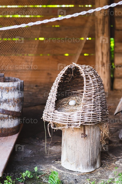 Плетеный домик для птицы с яйцом на деревянном пне в амбаре в деревне