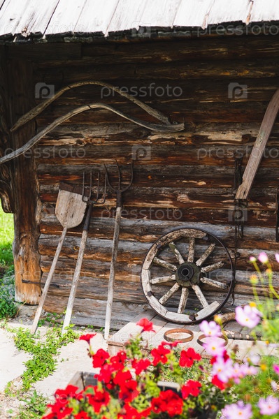 Старинные садовые инструменты и колесо телеги возле деревянного деревенского дома на улице