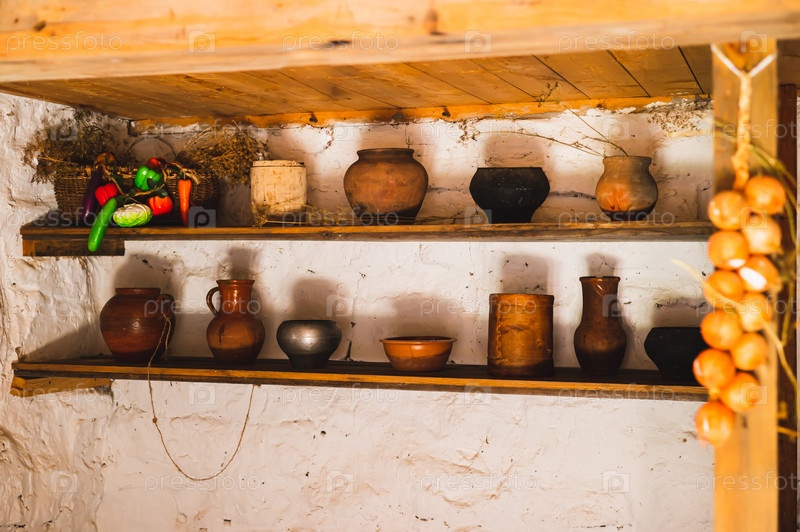 Старинные глиняные, металлические и берестяные горшки на полках в деревенском доме