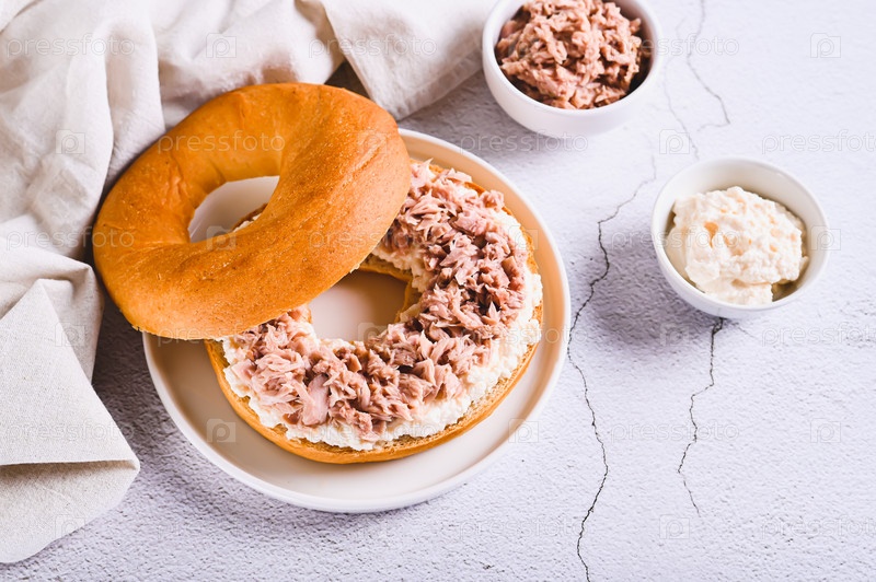 Сытный бургер с тунцом и рикоттой на тарелке на столе