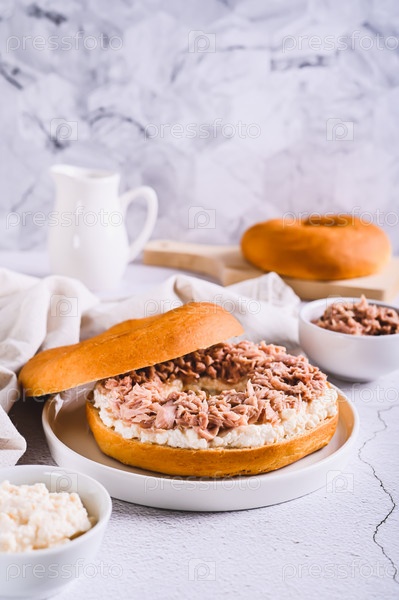 Пикантный бублик с рикоттой и консервированным тунцом на тарелке на столе вертикальный вид