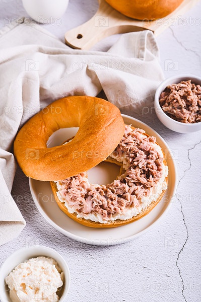 Сытный бургер с тунцом и рикоттой на тарелке на столе вертикальный вид