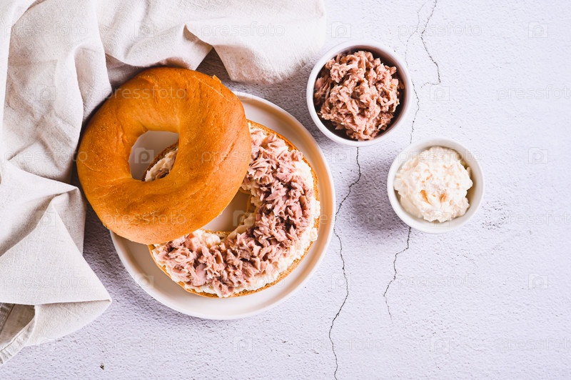Пикантный бублик с рикоттой и консервированным тунцом на тарелке на столешнице