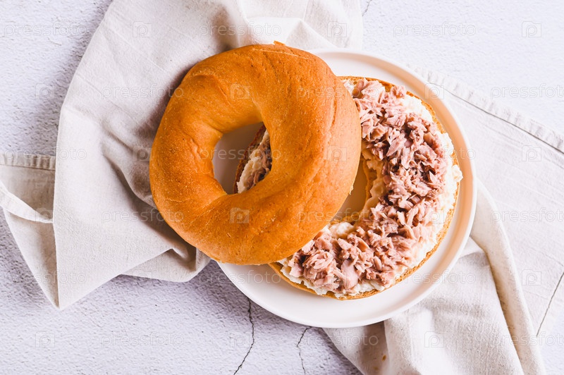 Крупный план пикантного бублика с рикоттой и консервированным тунцом на тарелке на столешнице
