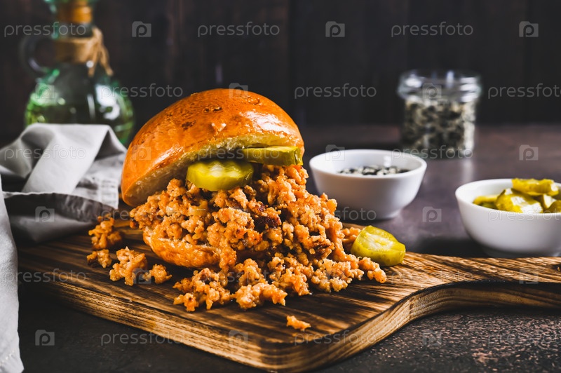 Острый бургер с мясным фаршем и солеными огурцами на доске на столе