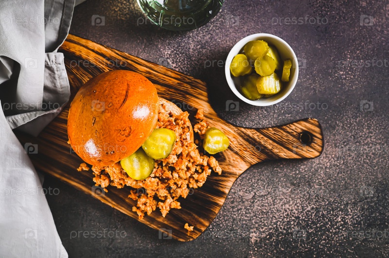 Острый бургер с мясным фаршем и солеными огурцами на доске на столешнице