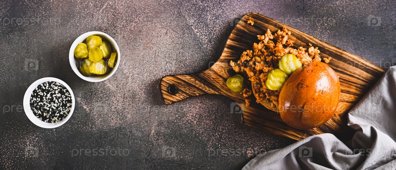 Сытный бургер с говяжьим фаршем и солеными огурцами на доске на столешнице веб-баннер