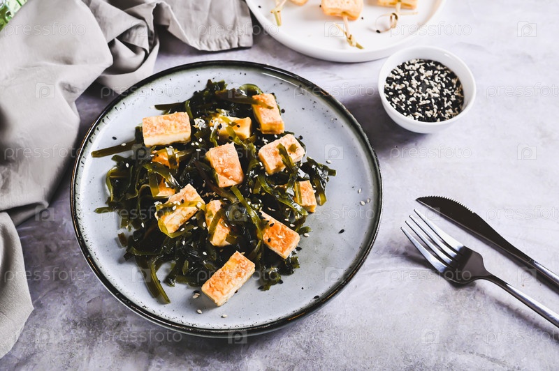 Салат из морских водорослей с жареным соевым сыром тофу на тарелке на столе