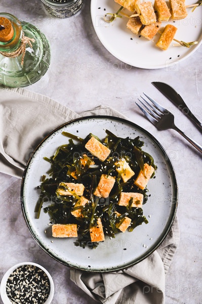 Салат из морских водорослей с жареным соевым сыром тофу на тарелке на столешнице и вертикальный вид