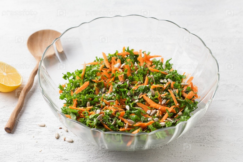 Салат с капустой, морковью и семенами в прозрачной салатнице на светло-сером фоне