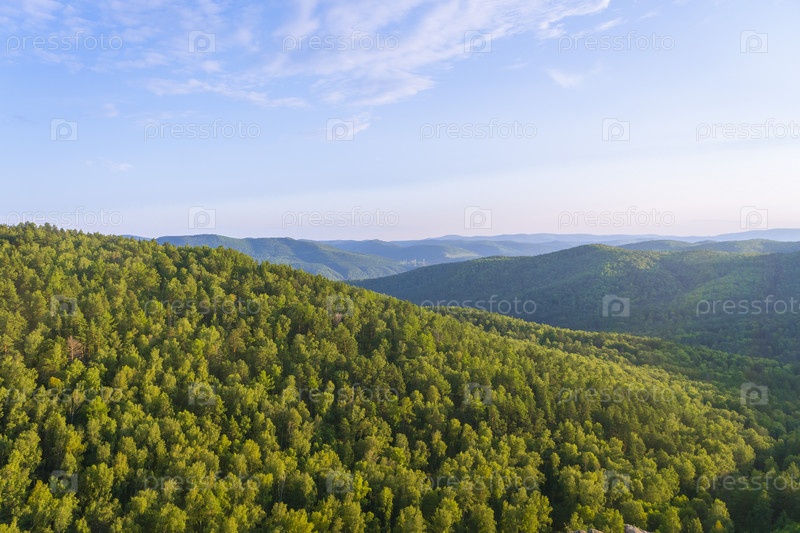 Яркий солнечный день в горах над сибирской рекой Енисей