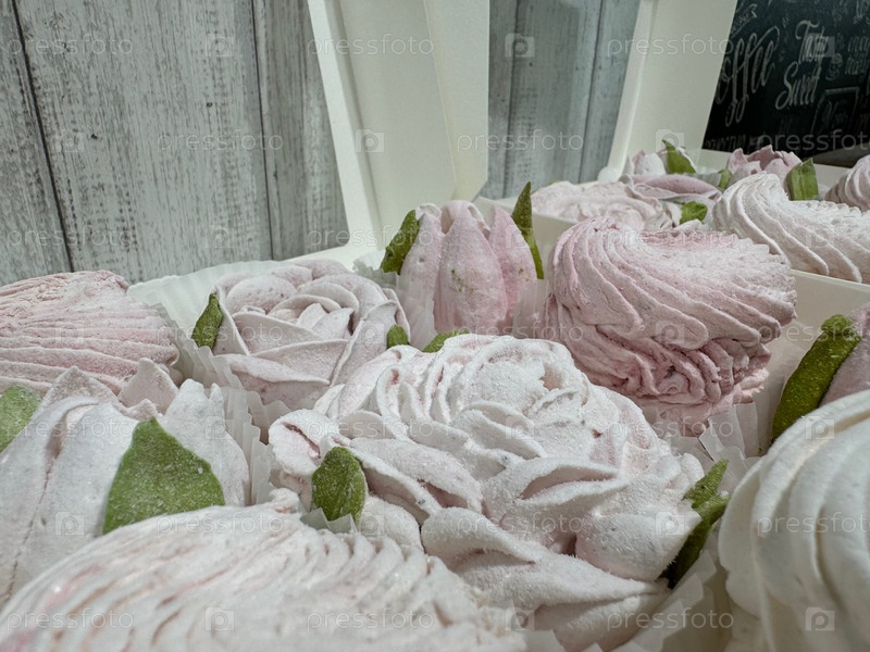 Домашние зефиры в открытых коробках. Цветы зефира и классические зефиры. Крупный план