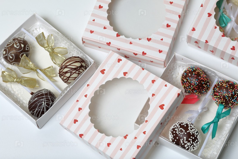 Кейк-попсы, украшенные бантом из тесьмы, упакованы в подарочную коробку