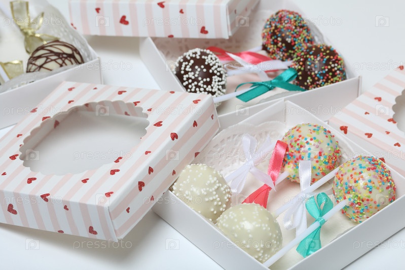 Кейк-попсы, украшенные бантом из тесьмы, упакованы в подарочную коробку