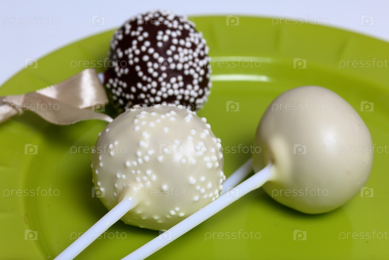 На тарелке лежат кейк-попсы, украшенные бантом из тесьмы