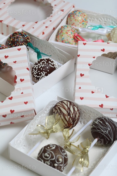 Кейк-попсы, украшенные бантом из тесьмы, упакованы в подарочную коробку