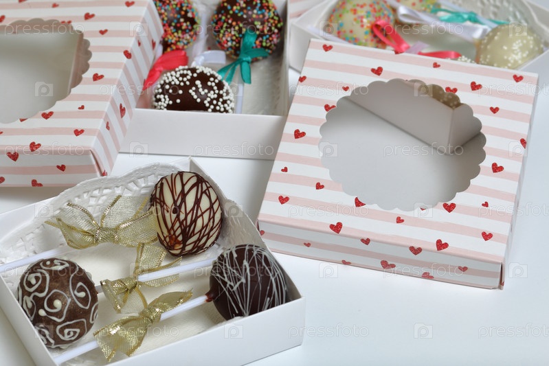 Кейк-попсы, украшенные бантом из тесьмы, упакованы в подарочную коробку