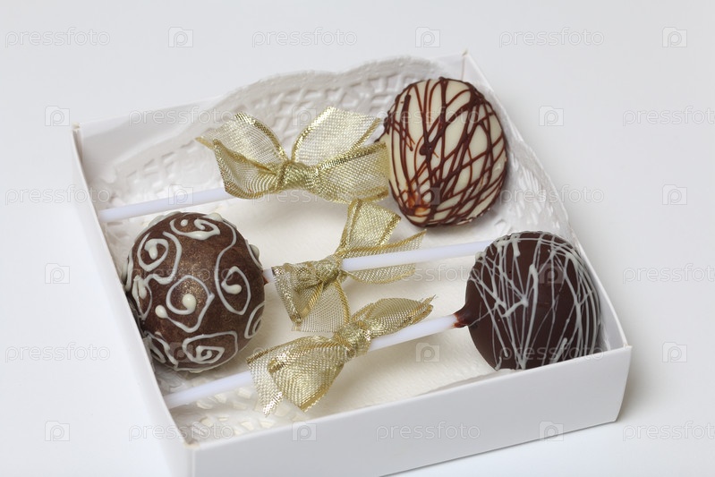 Кейк-попсы, украшенные бантом из тесьмы, упакованы в подарочную коробку