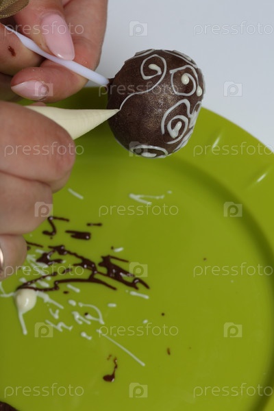 Женщина украшает с помощью белого шоколада кекс, покрытый темным шоколадом