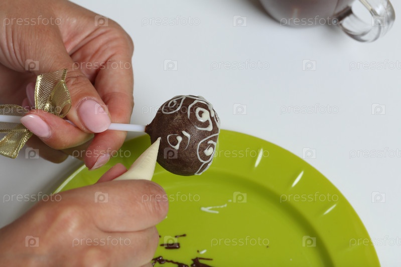 Женщина украшает с помощью белого шоколада кекс, покрытый темным шоколадом