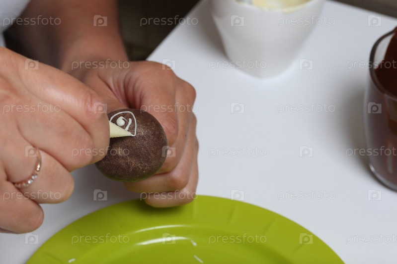 Женщина украшает с помощью белого шоколада кекс, покрытый темным шоколадом