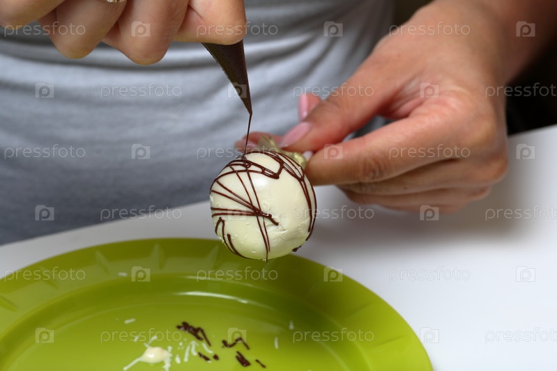 Женщина украшает кекс глазурью из темного шоколада