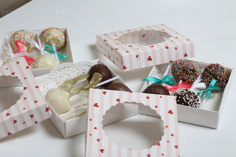 Кейк-попсы, украшенные бантом из тесьмы, упакованы в подарочную коробку