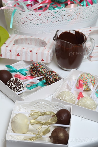 Кейк-попсы, украшенные бантом из тесьмы, упакованы в подарочную коробку. Рядом стоят стаканчики с растопленным шоколадом и контейнер с лентами разных цветов