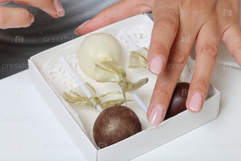 Женщина кладет кейк-попсы в подарочную коробку. Конфеты в форме ножниц-палочек. Конфеты украшены лентами
