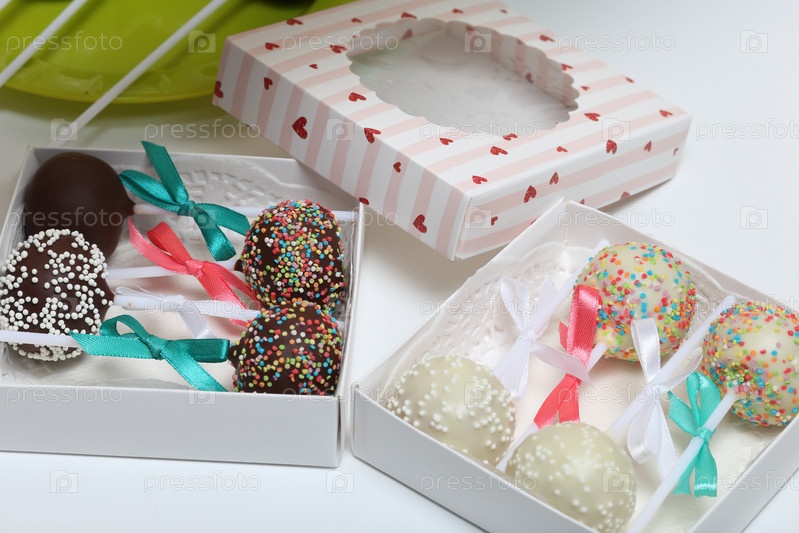 Кейк-попсы, украшенные бантом из тесьмы, упакованы в подарочную коробку