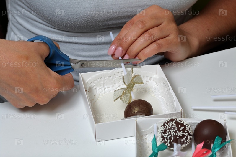 Женщина кладет кейк-попсы в подарочную коробку. Конфеты в форме ножниц и палочек