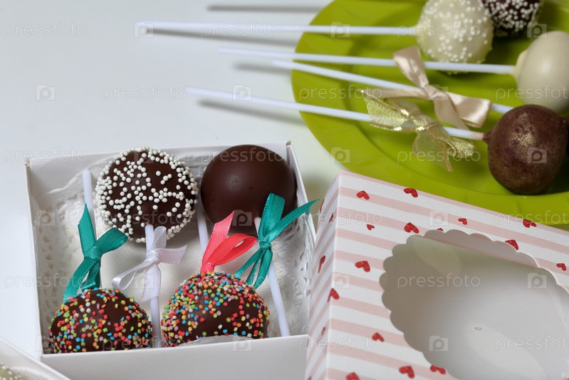 Кейк-попсы, украшенные бантом из тесьмы, упакованы в подарочную коробку. Остальные сладости рядом на тарелке