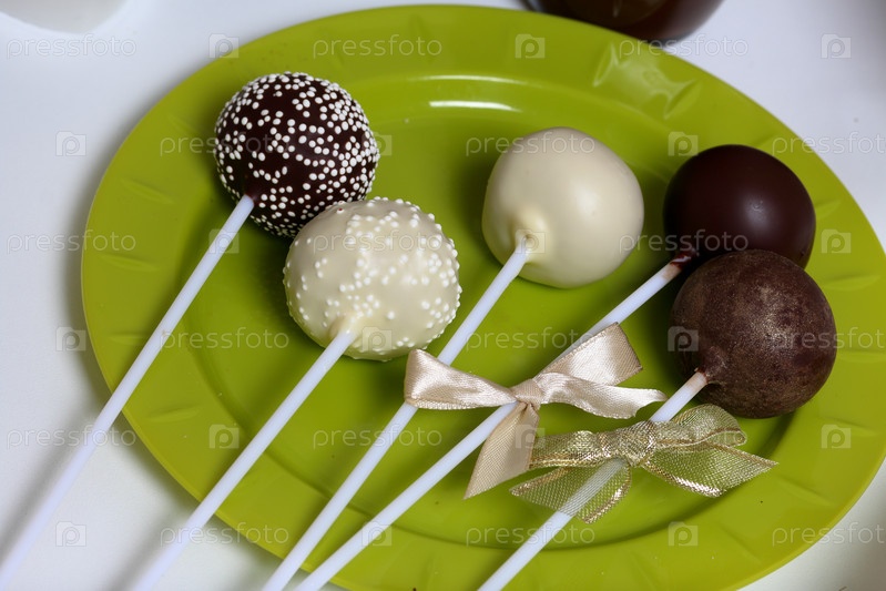 На тарелке лежат кейк-попсы, украшенные бантом из тесьмы