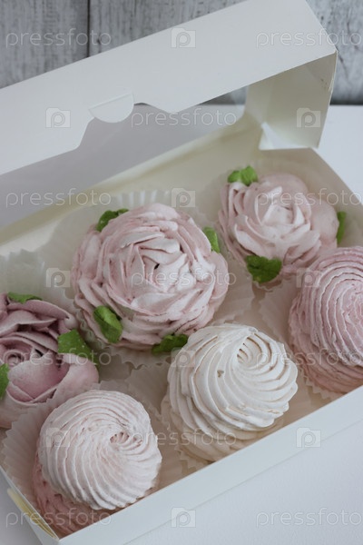 Домашний зефир в открытой коробке. Цветы зефира. Крупный план
