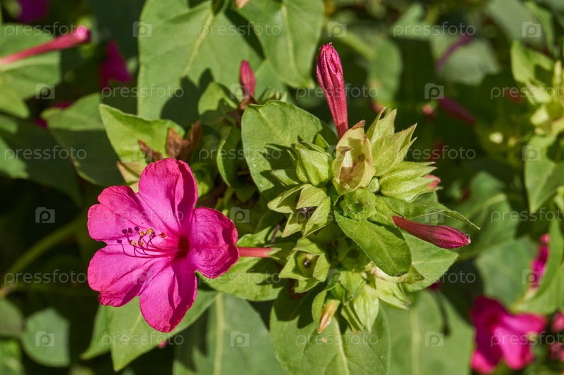 Яркий цветок мирабилис (лат. Mirabilis jalapa) крупный план в летнем саду.Ночная красавица, или слабительный мирабилис, является типичным видом рода Mirabilis семейства Nictaginaceae