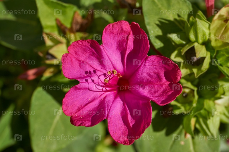 Яркий цветок мирабилис (лат. Mirabilis jalapa) крупный план в летнем саду.Ночная красавица, или слабительный мирабилис, является типичным видом рода Mirabilis семейства Nictaginaceae