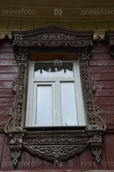 Красивые резные наличники деревянного дома в городе Суздаль Владимирской области, входящем в Золотое кольцо России