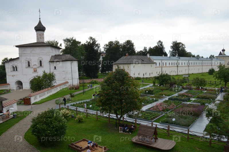 Вид на территорию Спасо-Евфимиева мужского монастыря в городе Суздаль Владимирской области, входящем в Золотое кольцо России: Церковь Благовещения Пресвятой Богородицы, Братский корпус, Аптекарский огород