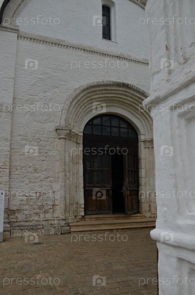 Ворота (вход) украшенные белокаменной резьбой Рождественского собора (Собор Рождества Превятой Богородицы) Суздальского кремля – древнейшей части города Суздаль Владимирской области, входящего в Золотое кольцо России