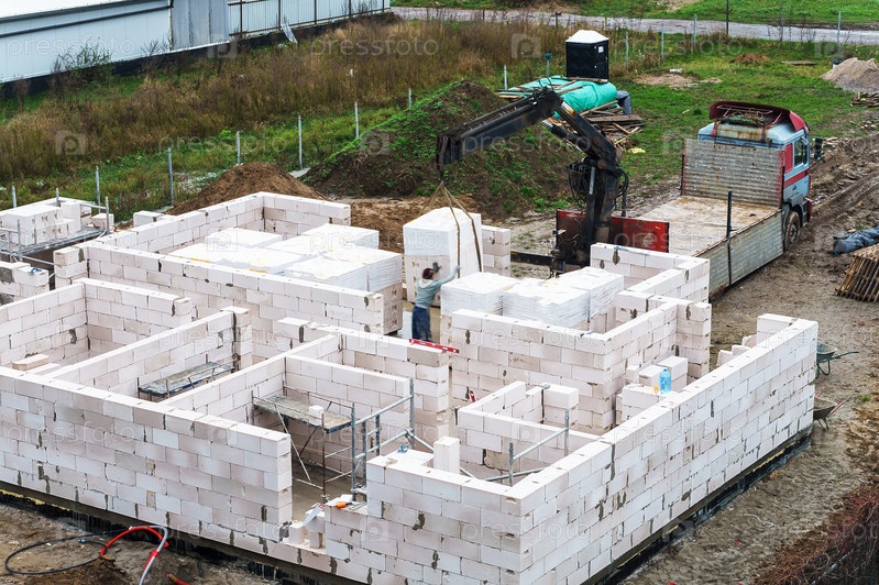 Россия - 2022, 11 ноября: Строительство частного дома. Строительство на частной территории. Дом из белого кирпича