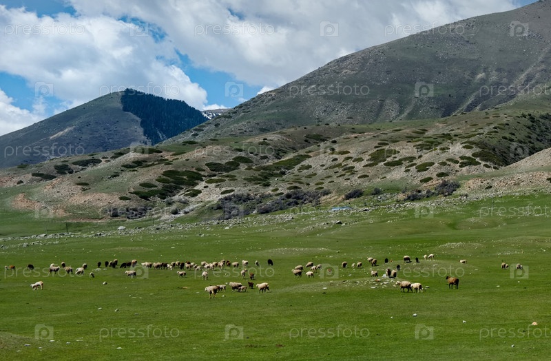 Киргизия, озеро Иссык-Куль. Панорамный вид высокогорного пастбища между Григорьевским и Семеновским ущельями