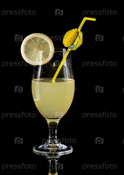 Бокал с желтым напитком и кружком лимона на черном фоне