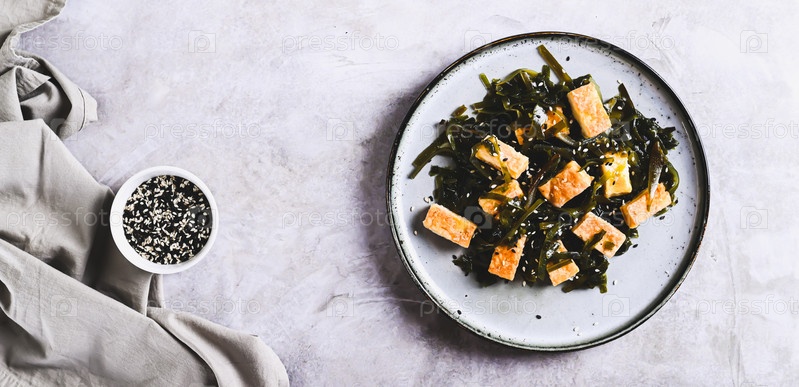 Салат из морских водорослей с жареным соевым сыром тофу на тарелке на столешнице веб-баннер