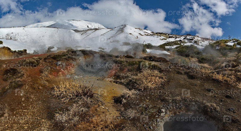Россия. Курильские острова. Панорамный вид на россыпь дышащих фумарол у подножия спящего вулкана Барановский на острове Итуруп