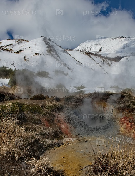 Россия. Курильские острова. Панорамный вид на россыпь дышащих фумарол у подножия спящего вулкана Барановский на острове Итуруп