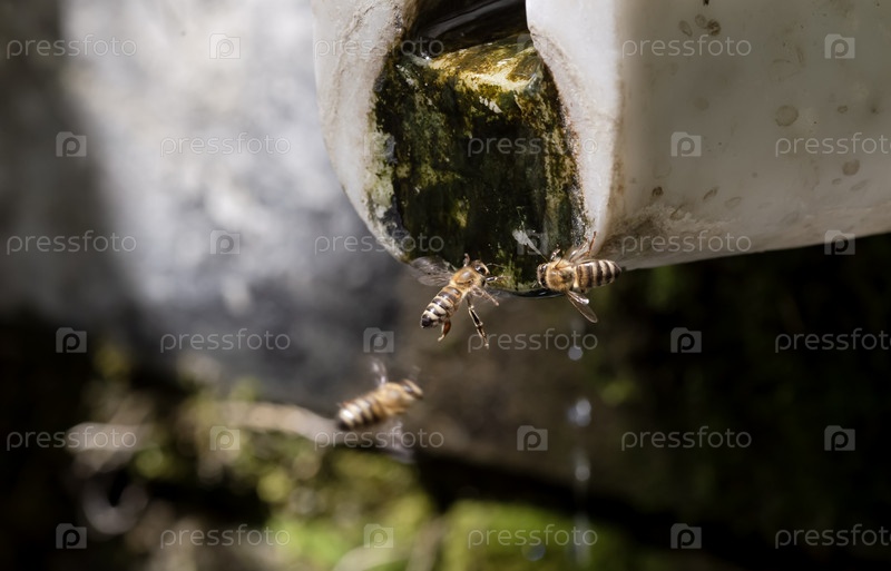 Дикая пчела (Apis mellifera) пьет воду крупным планом