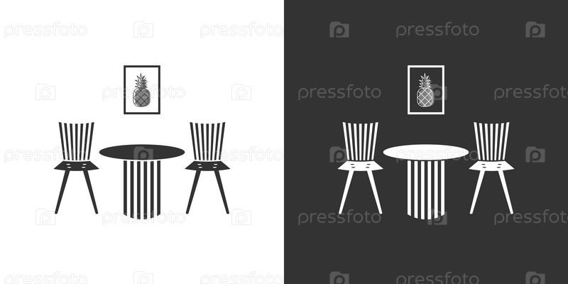 Черная и белая иконка интерьера со стульями, столом и постером в плоском стиле