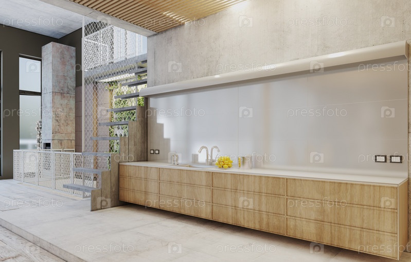 Минималистическая кухня с промышленным дизайном и открытым пространством. 3D-рендеринг